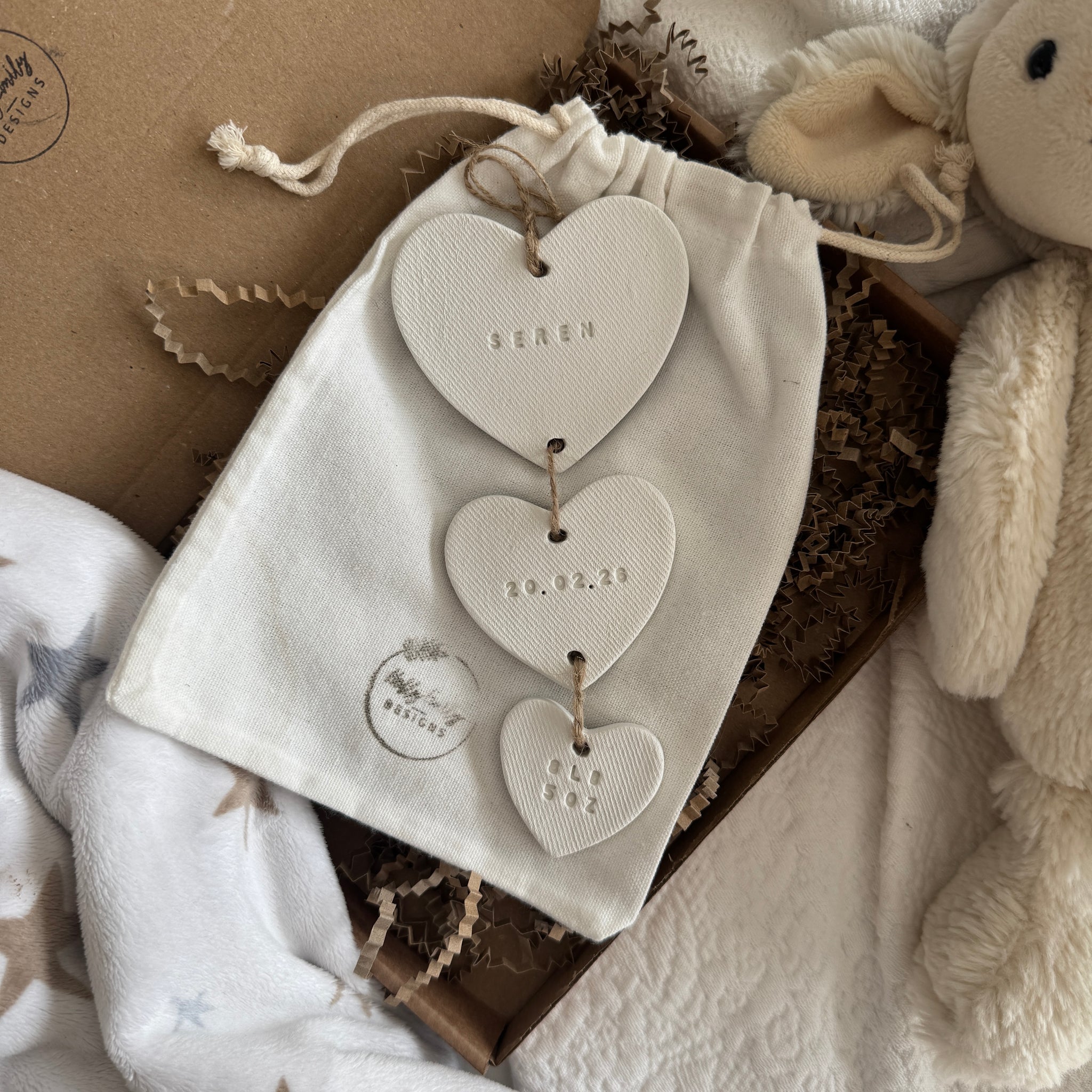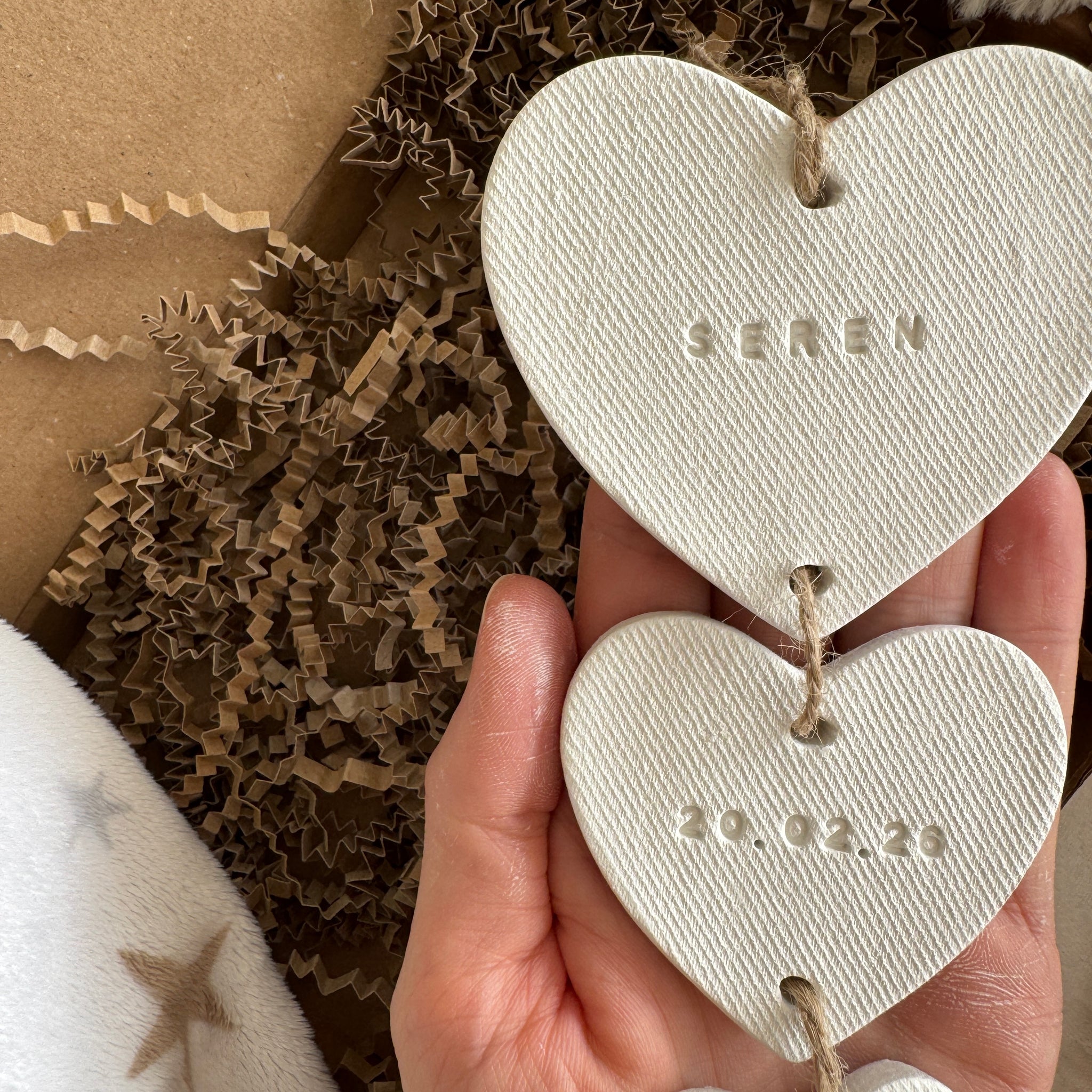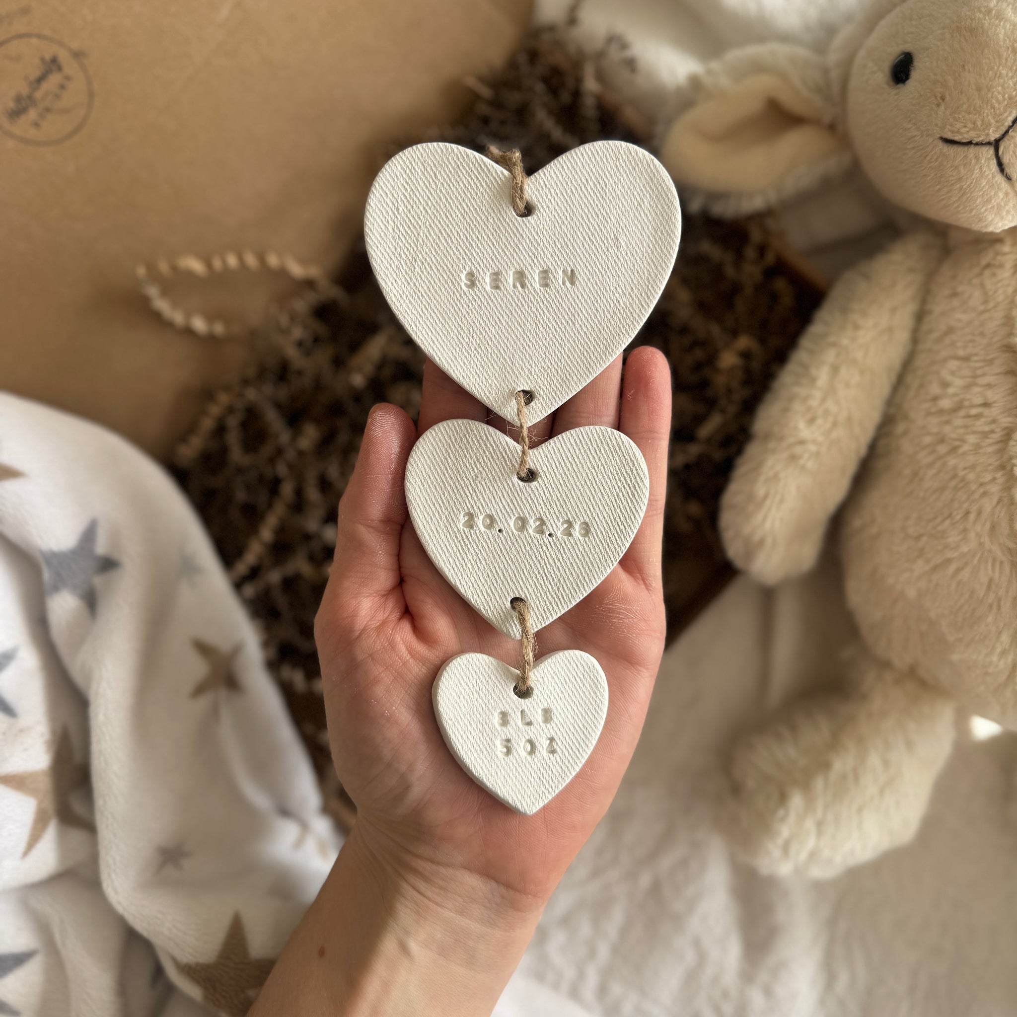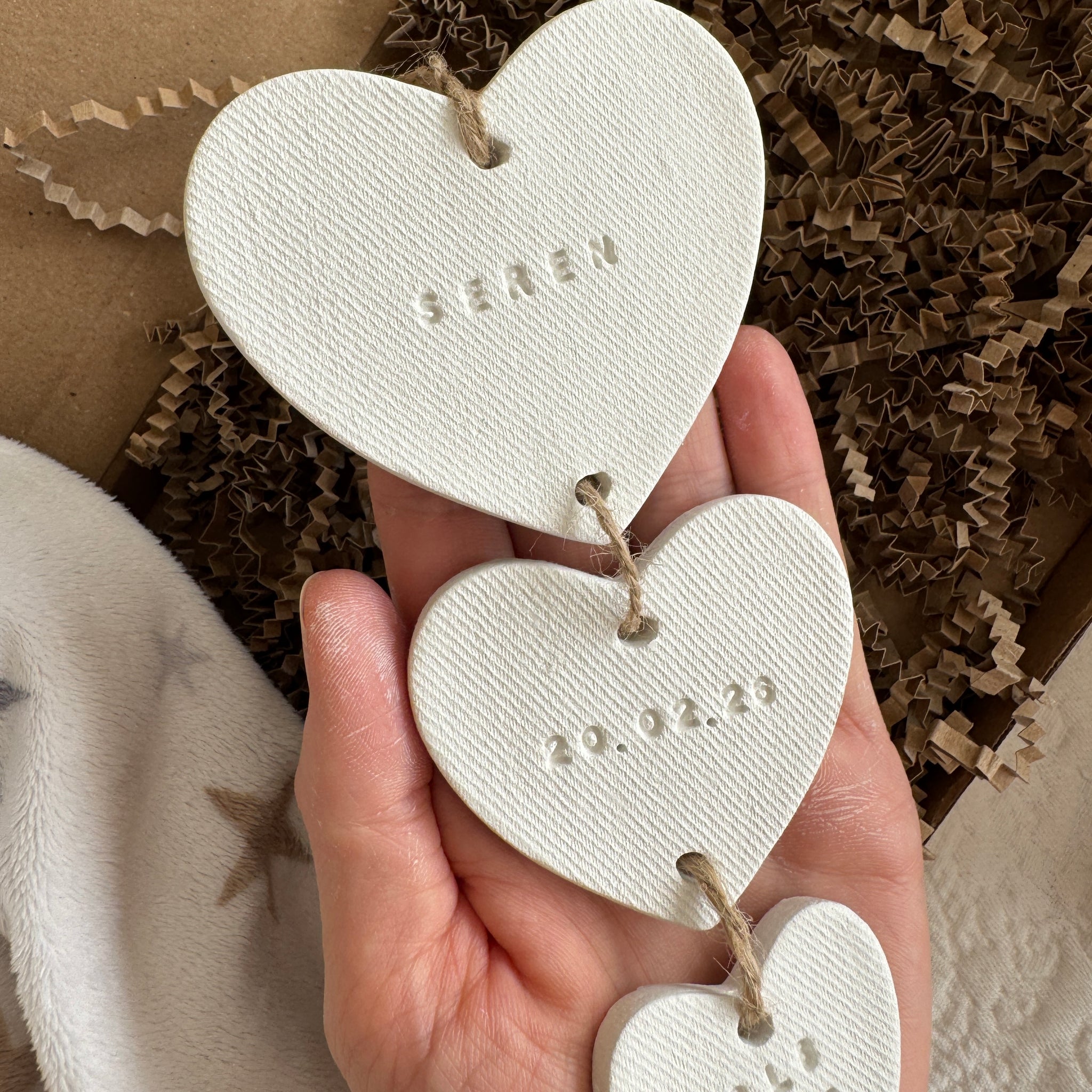 This is a personalised baby heart keepsake made out of clay, completely handmade from start to finish. It’s a hanging ornament which is a beautiful addition to a baby nursery or to hang on a gift bag to add that personalised touch when gifting.
