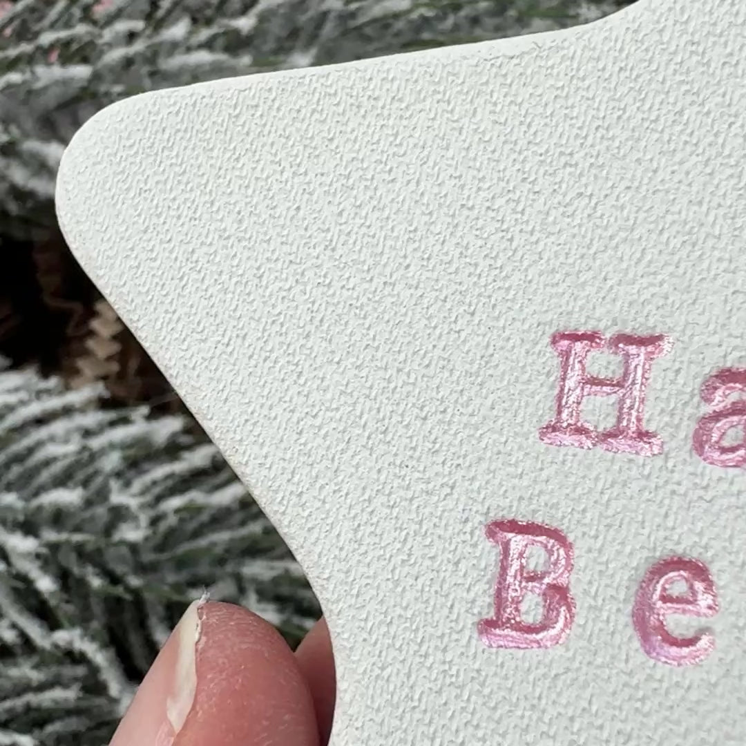 Hand-cut from clay with a textured imprint on the surface, they are stamped with your choice of name and then intricately hand painted to infill the name