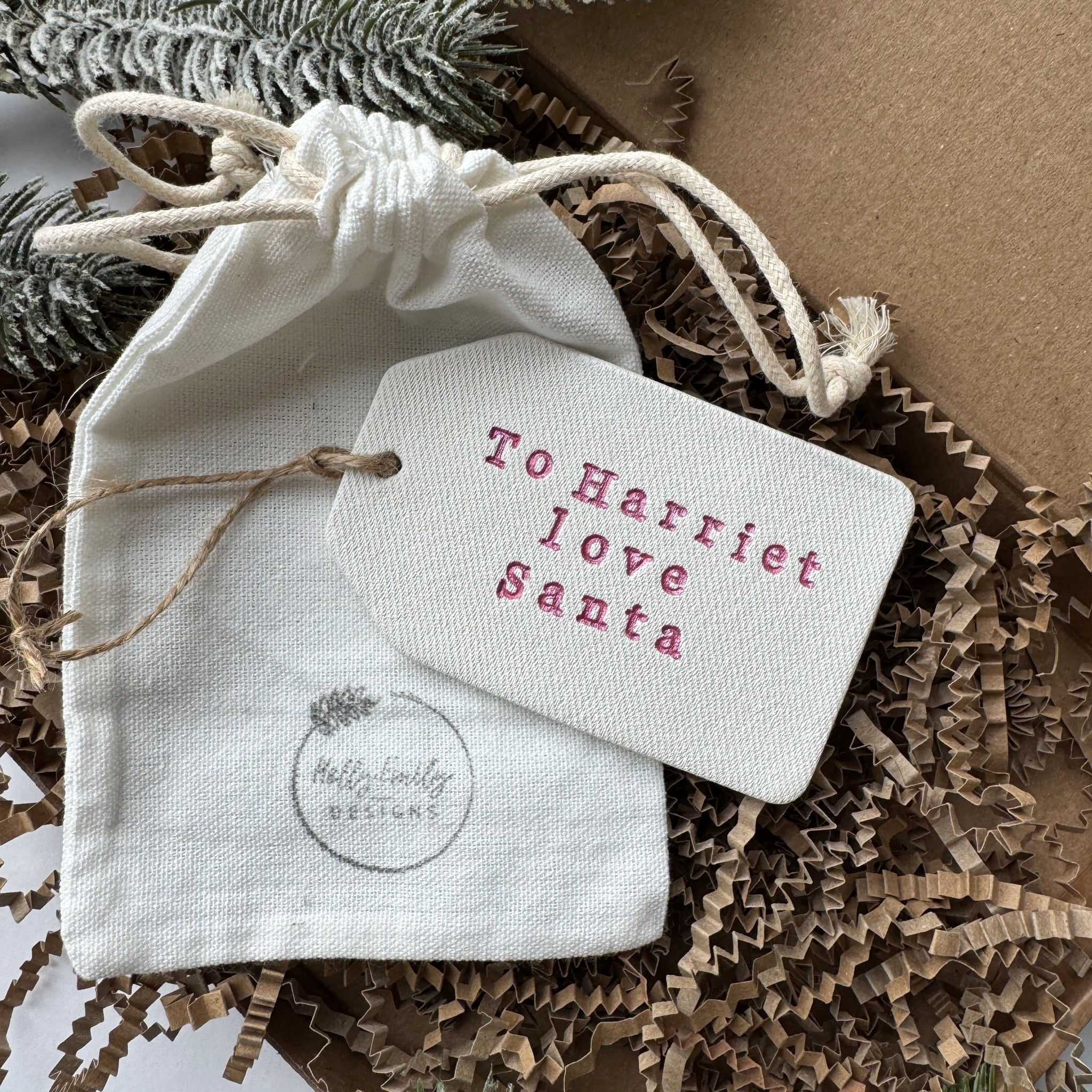 You can also add a cotton gift bag to your order. This also has the option of being ink stamped with first name to match the name on the tag. Please select from the drop down menu box if you wish to add this.