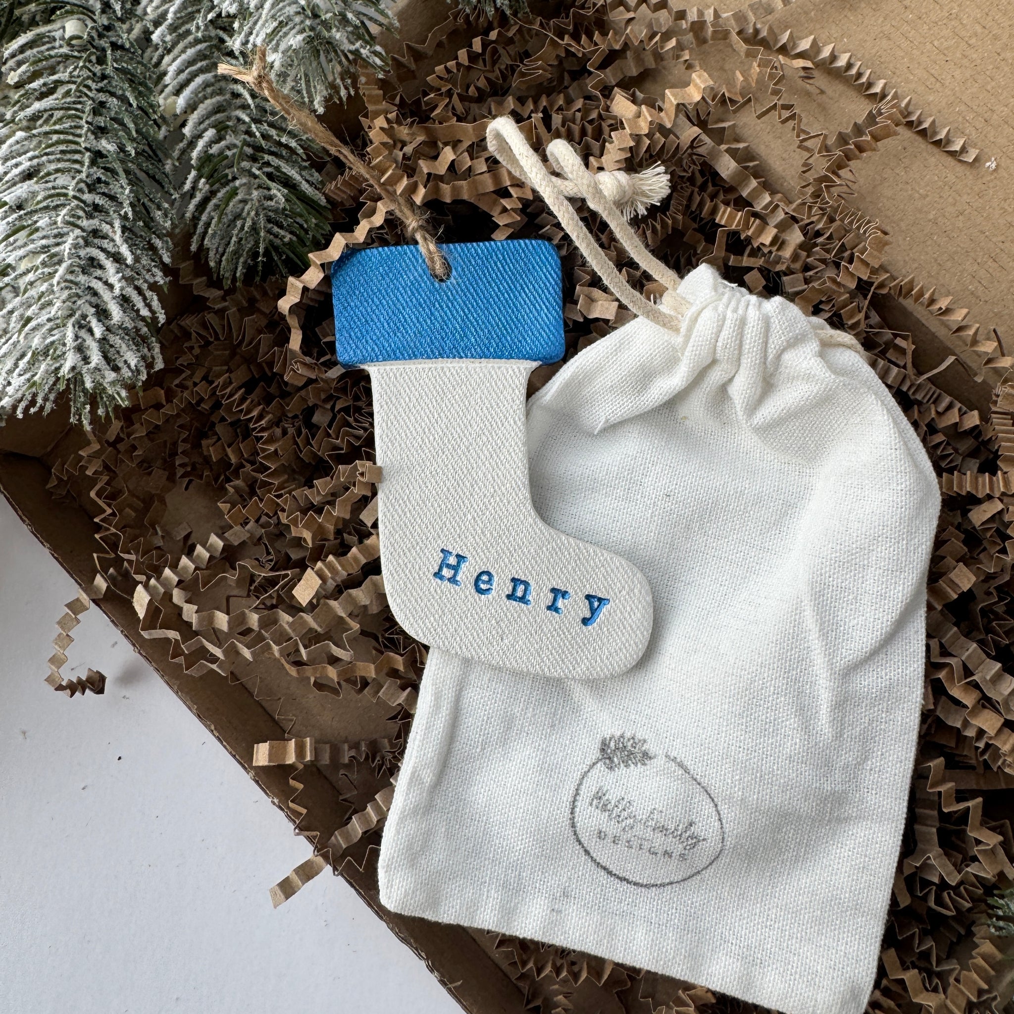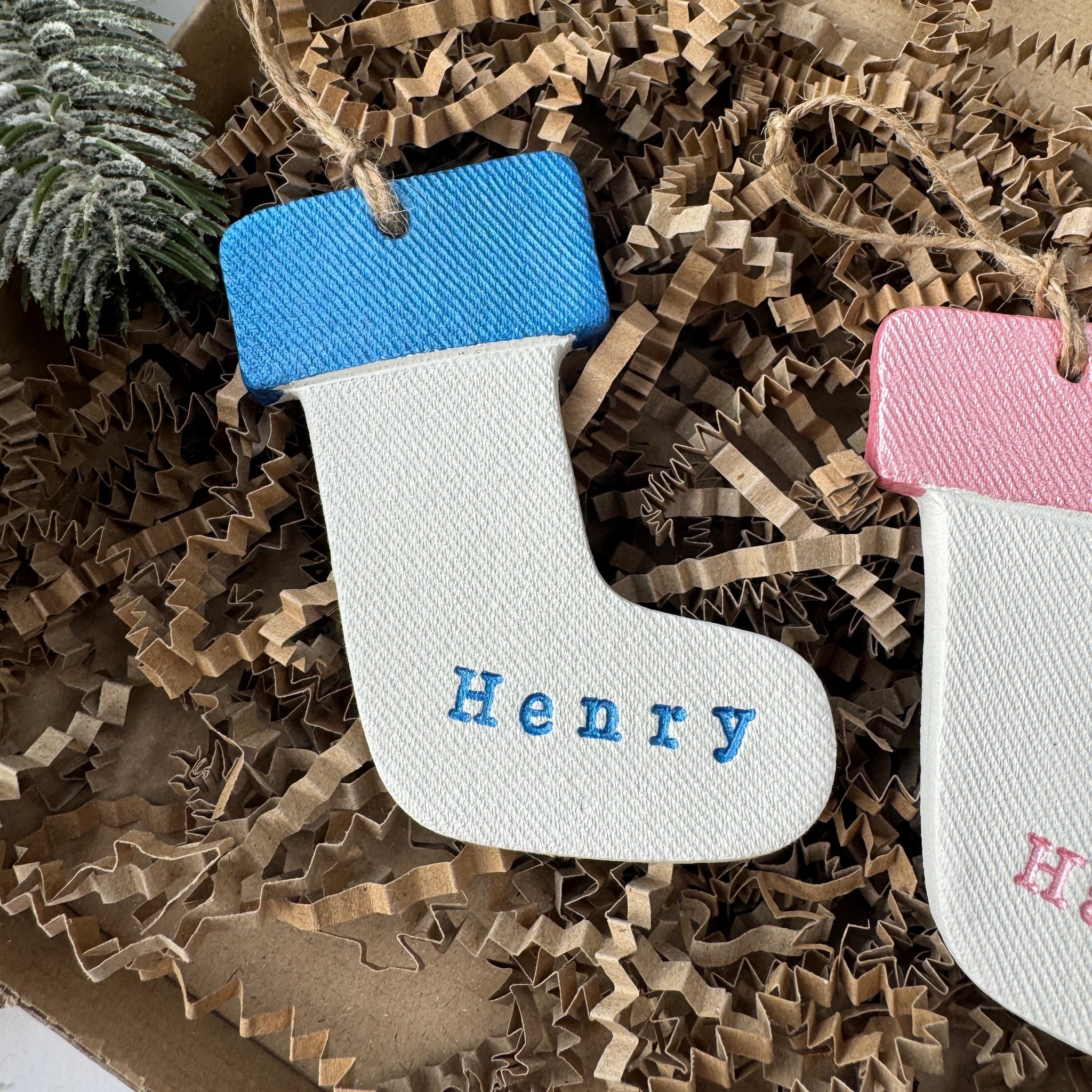 This is a personalised CHRISTMAS stocking decoration made out of clay, completely handmade from start to finish. These are perfect to add that unique personal touch for Christmas. These come in lots of different colour options making them fab to match any colour theme for Christmas . Add a personalised touch to your children’s stockings and add this little personalised decoration to give it that unique touch .
