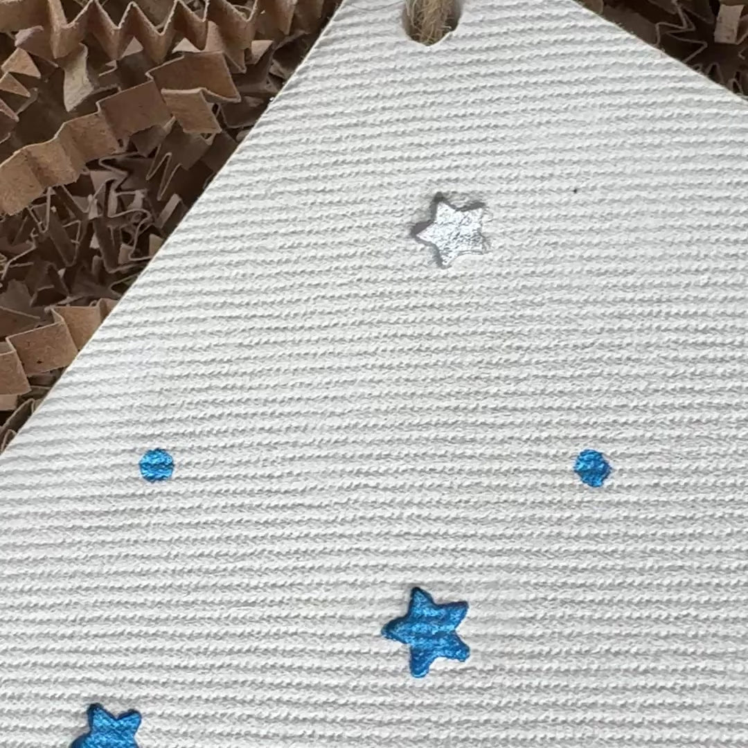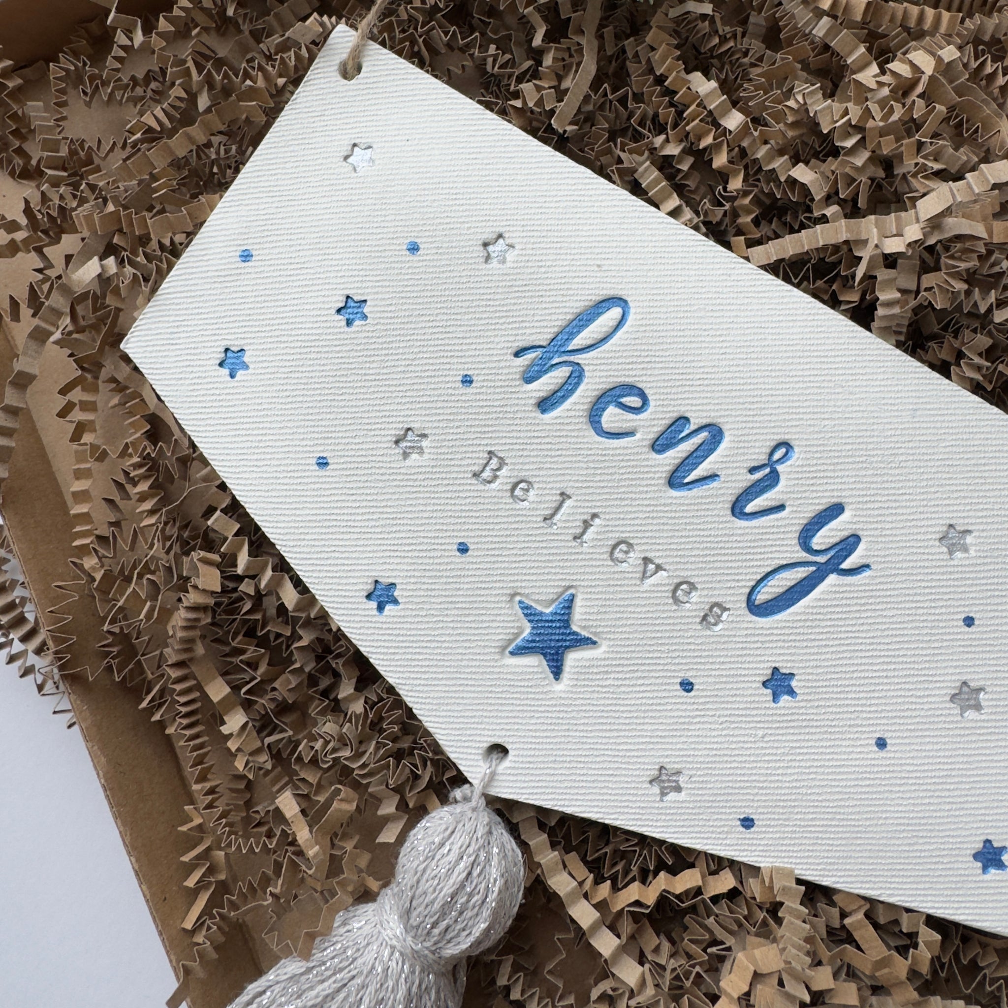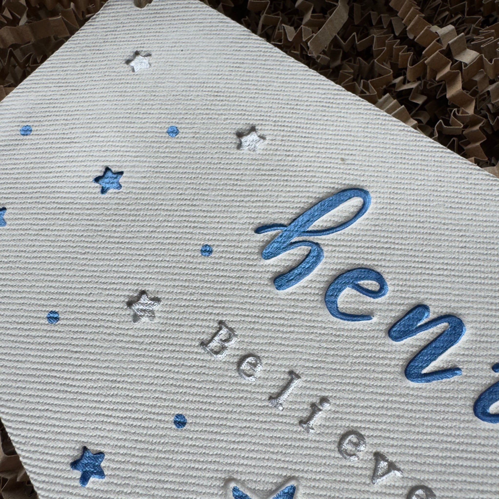 Handcut from clay these are handstamped with your choice of wording. They are imprinted with one name in large brush lettering followed by the wording “believe” underneath. These are then hand painted, choose your tassel colour which will match the colour of the lettering. Please add what combination of colours you would like in the personalisation box.