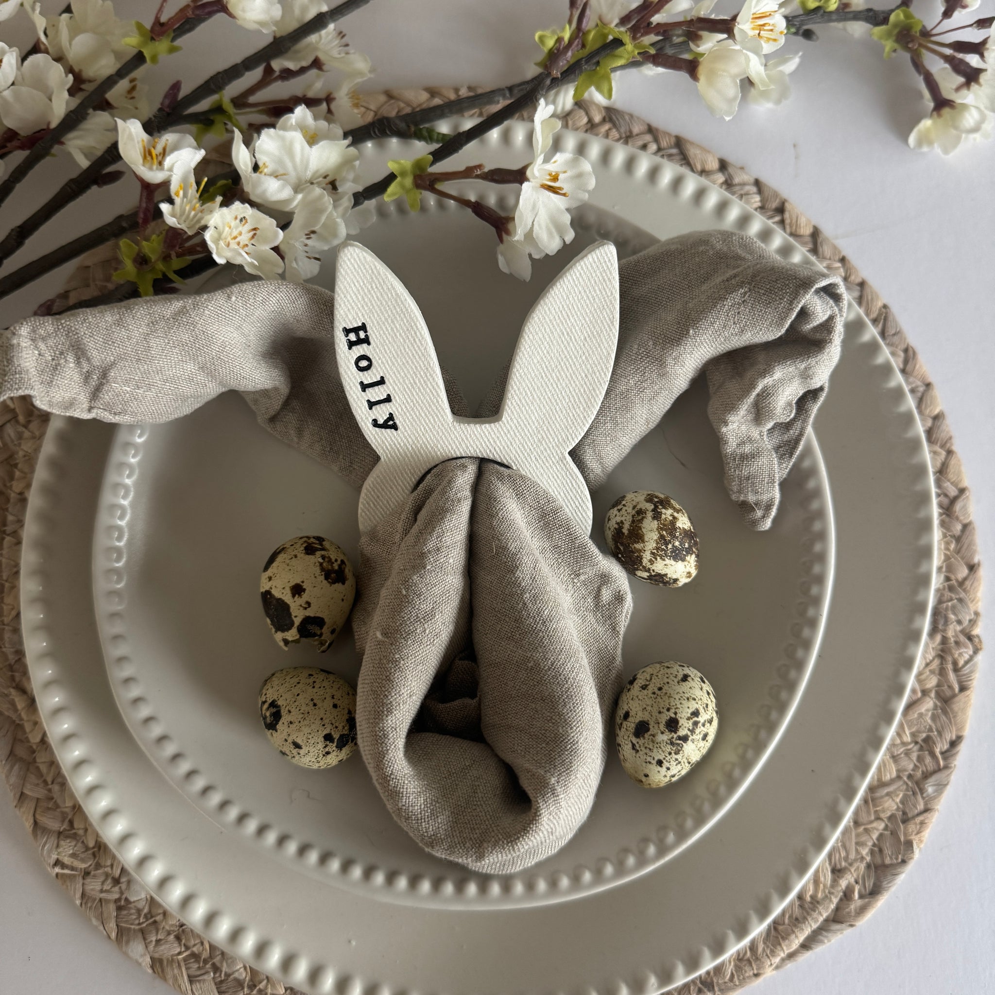 Add a thoughtful, handmade touch to your Easter table with this personalised clay rabbit napkin holder. Each piece is carefully shaped by hand and finished with a custom name, making it a meaningful detail for place settings or a lovely Easter gift.