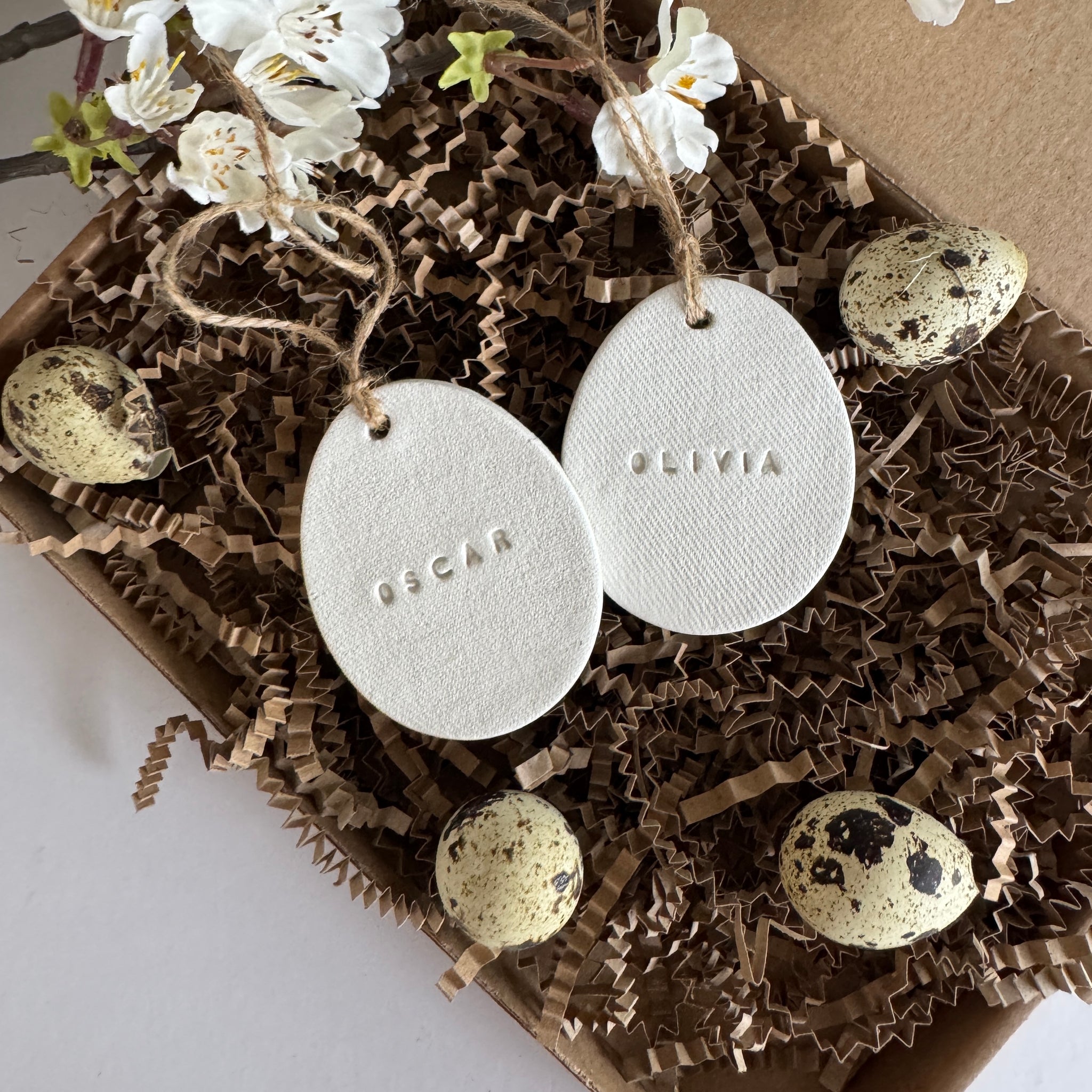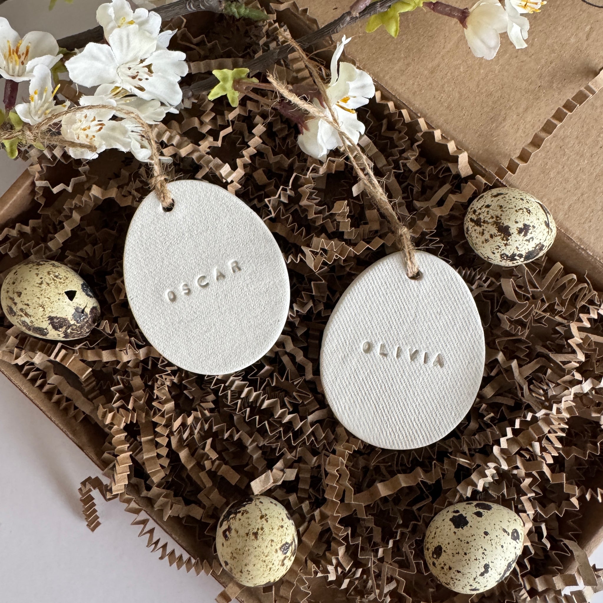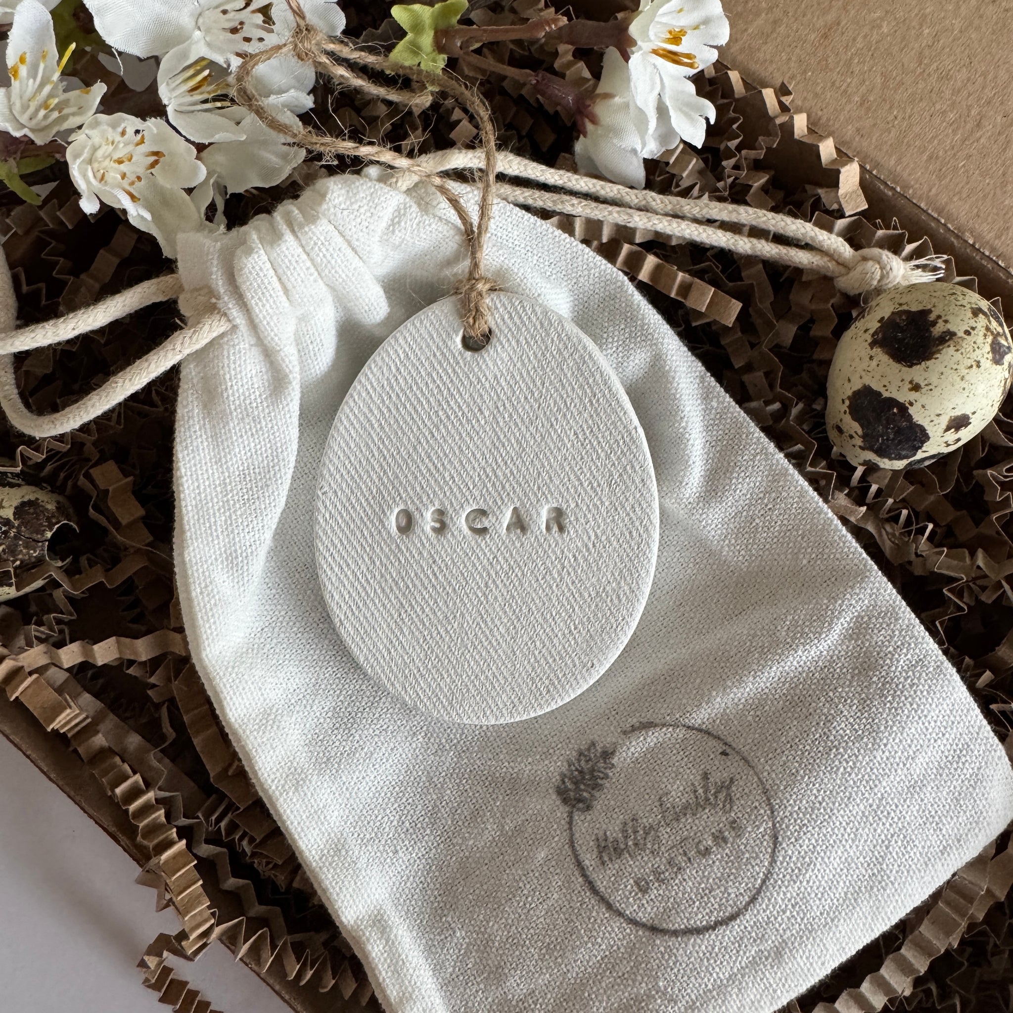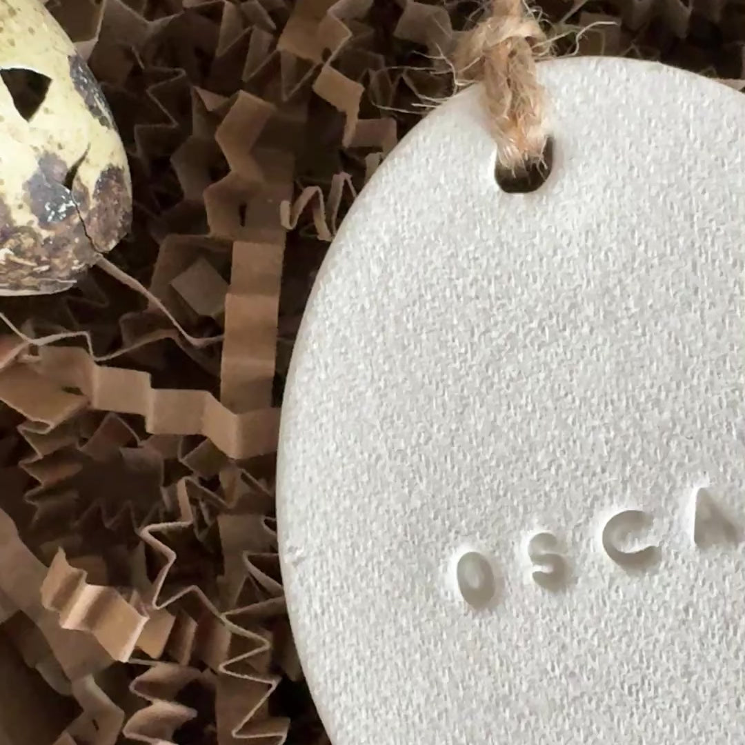 This handmade clay egg ornament is individually shaped and embossed with a name, creating a subtle yet meaningful decorative accent. Finished in a neutral, matte tone and tied with natural jute twine, it blends beautifully with farmhouse, minimalist, and seasonal décor.
