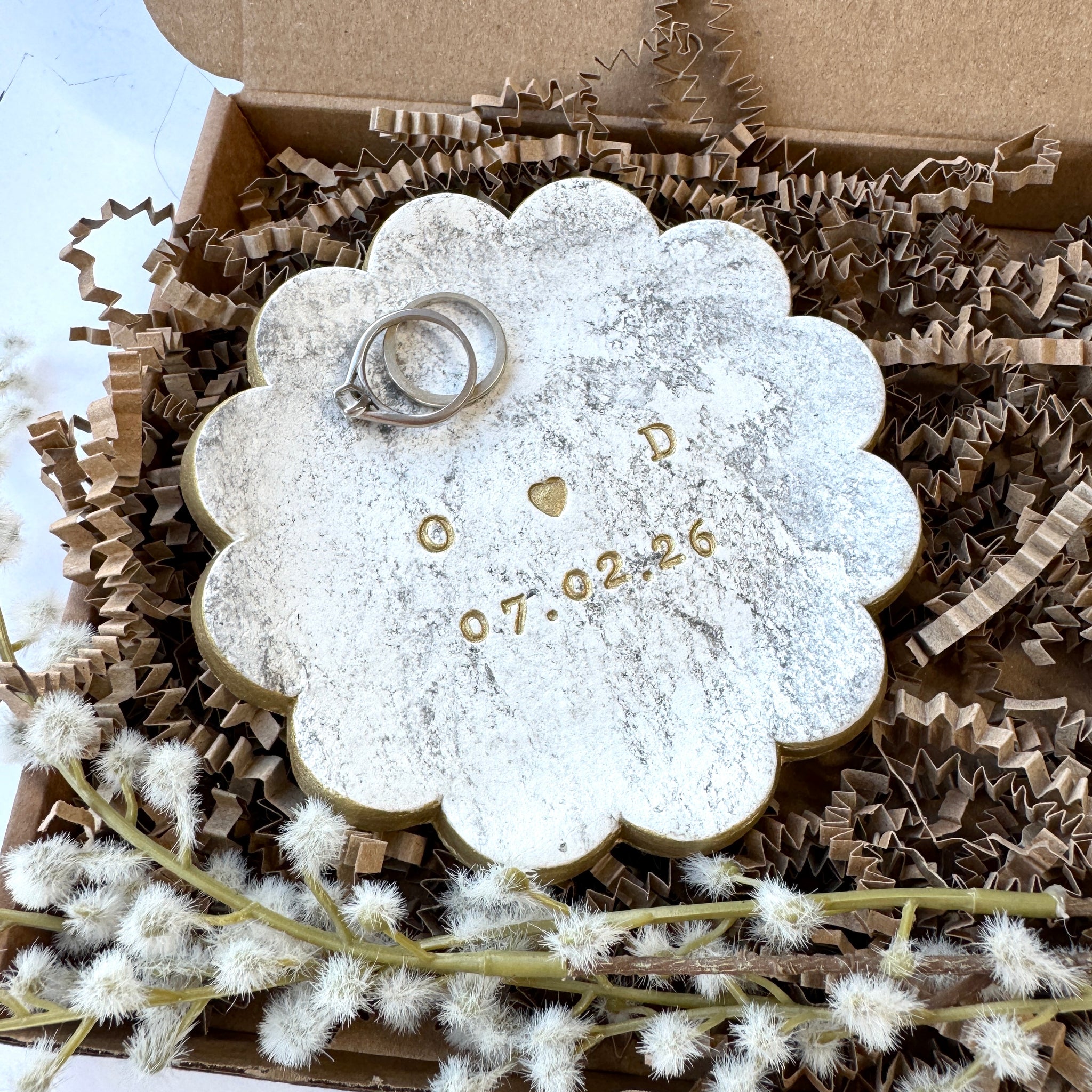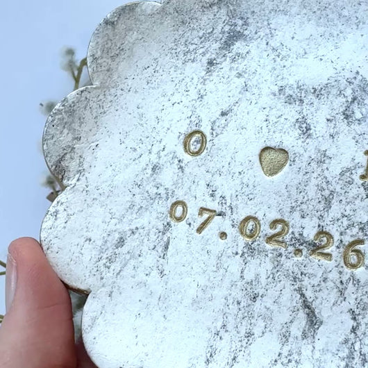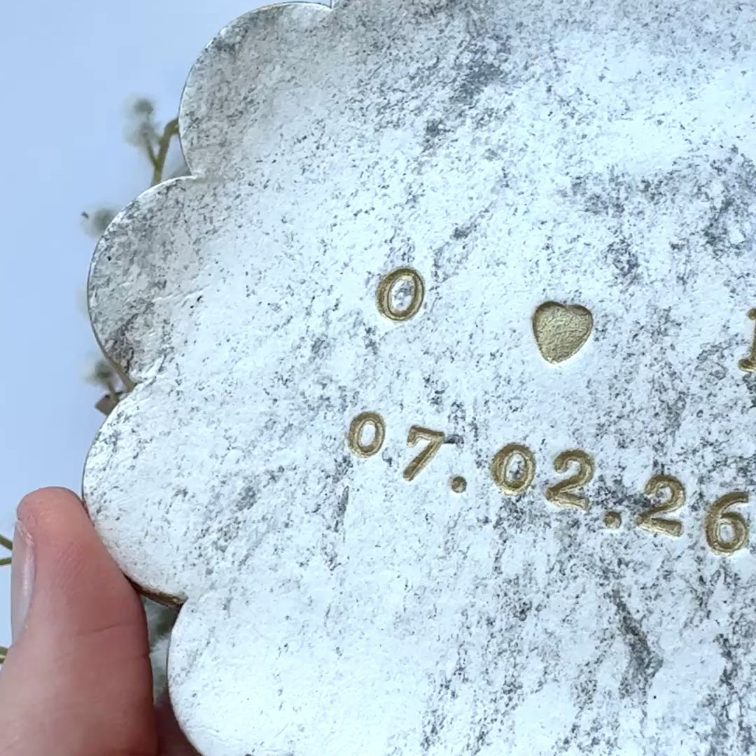 A personalised jewellery holder dish created for life’s most meaningful pieces, a perfect gift for a special wedding day. With a timeless marble effect, elegant scalloped edge, and custom initials with date, this ring dish is a heartfelt wedding gift, engagement gift, or anniversary present couples will treasure forever.