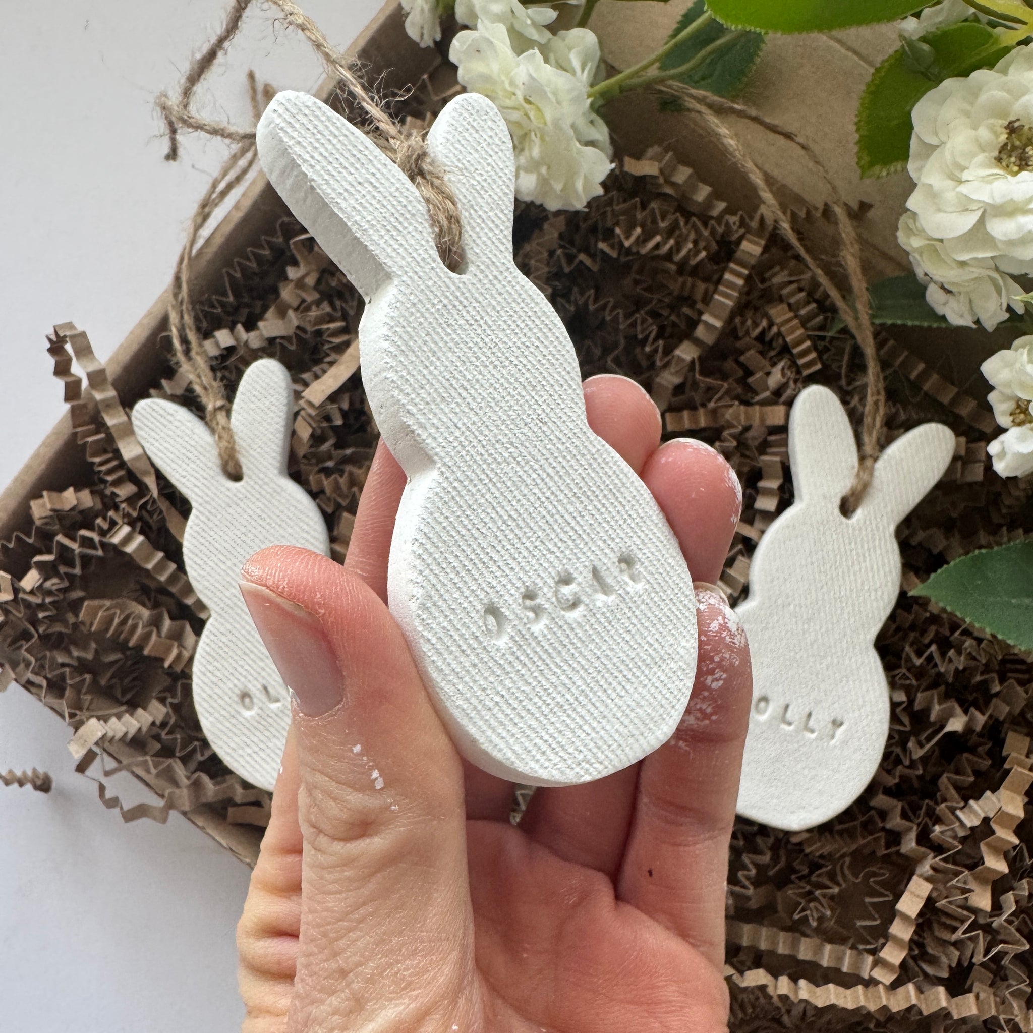 This is a personalised rabbit easter decoration made out of clay, completely handmade from start to finish. These have been my ultimate bestseller for the last 6 years, attach to an Easter Basket, Easter tree or use as a place setting for your Easter table. It’s a hanging decoration with jute string, so can be attached to gift bags or hung for decor.