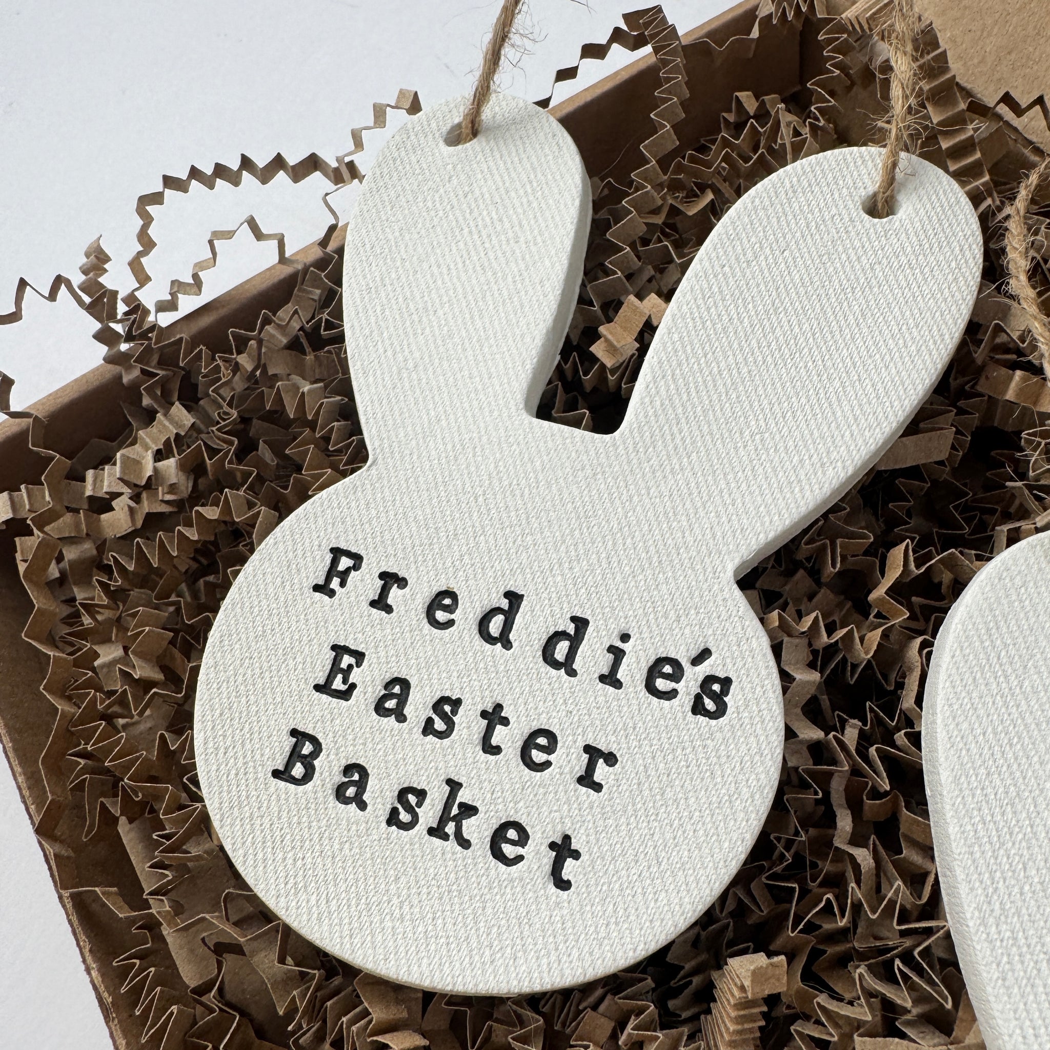 Each bunny is individually shaped from clay, carefully painted by hand, and personalised with a name, making it the perfect finishing touch for an Easter basket, gift box, or spring display. No two are exactly alike, which is part of their magic.